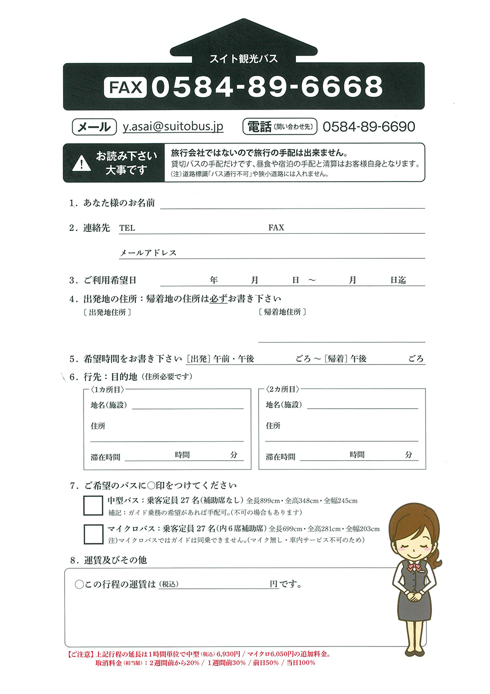 バス料金は概算では出せません。下記FAX用紙をプリントいただきご利用ください。